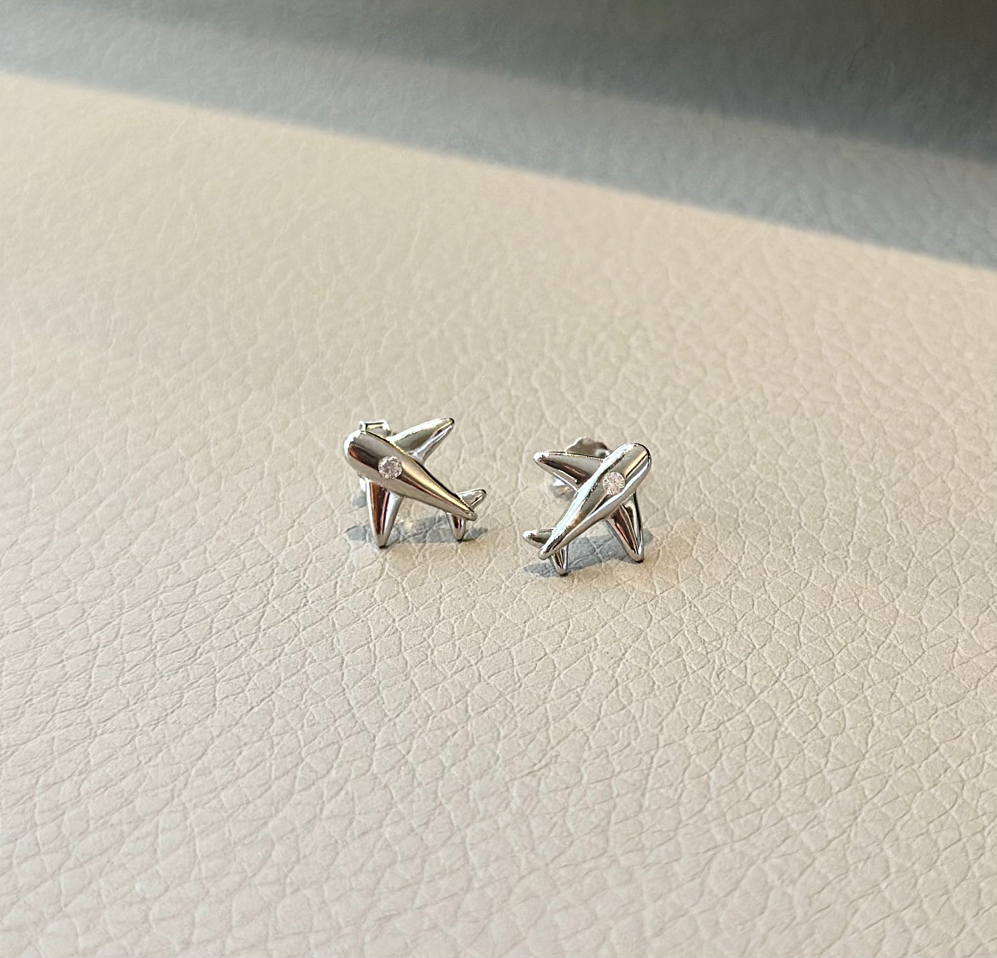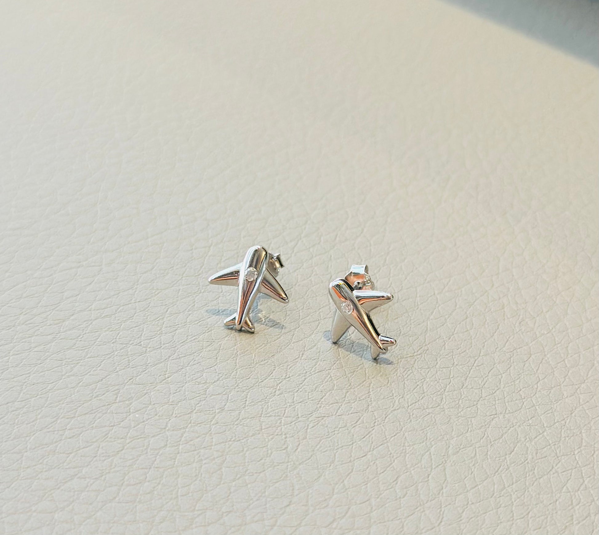 These minimalist high-quality silver aircraft earrings are crafted with meticulous attention to detail, showcasing the intricate design of an airplane and a zircon in the middle of fuselage.