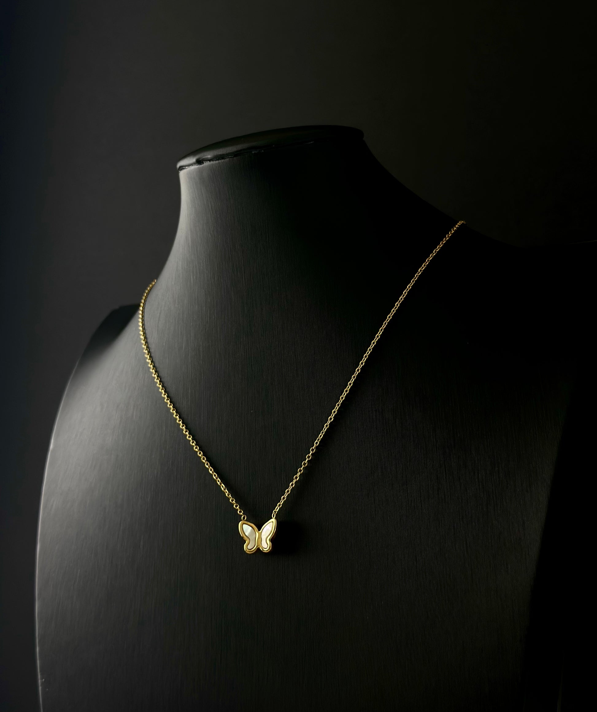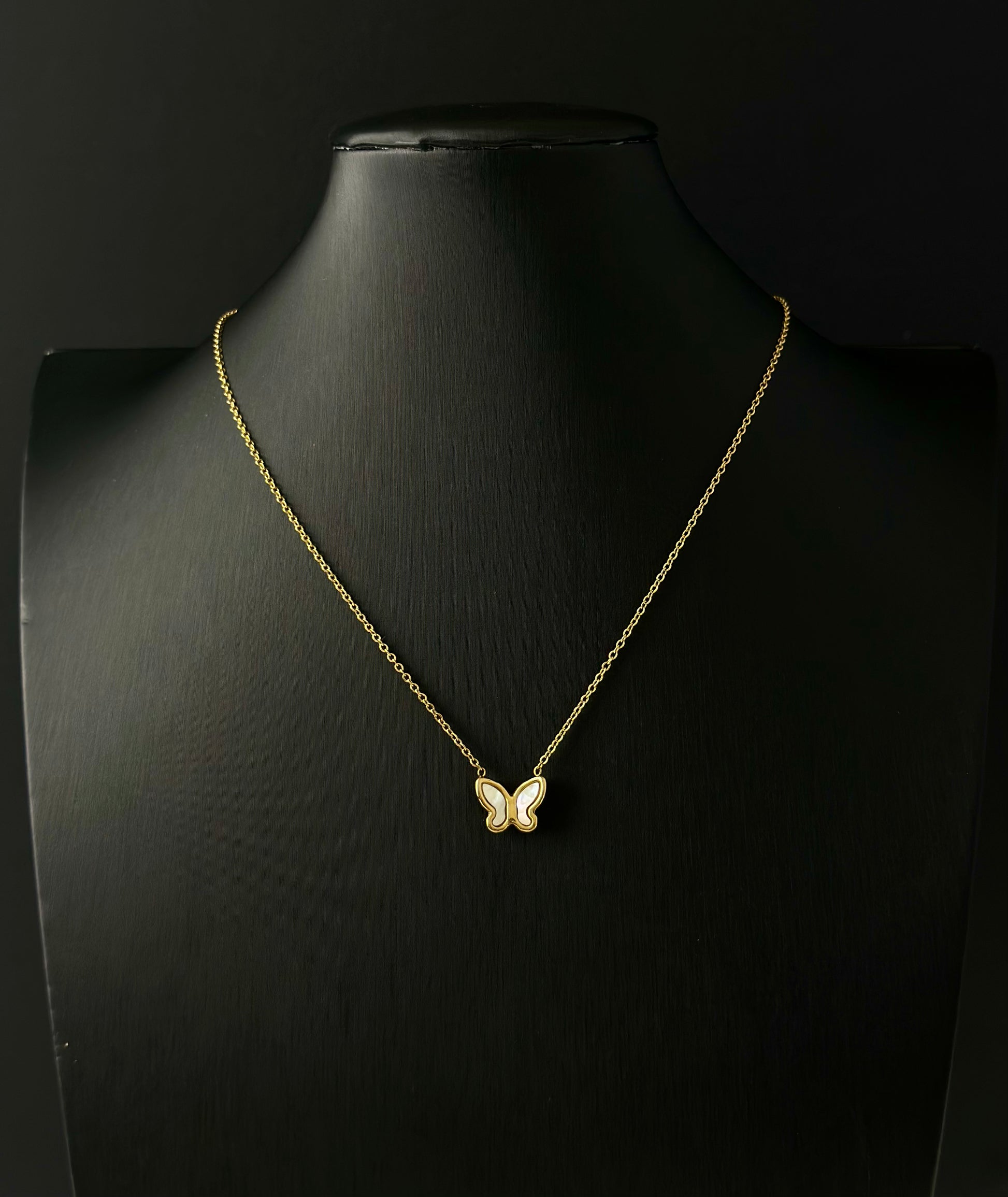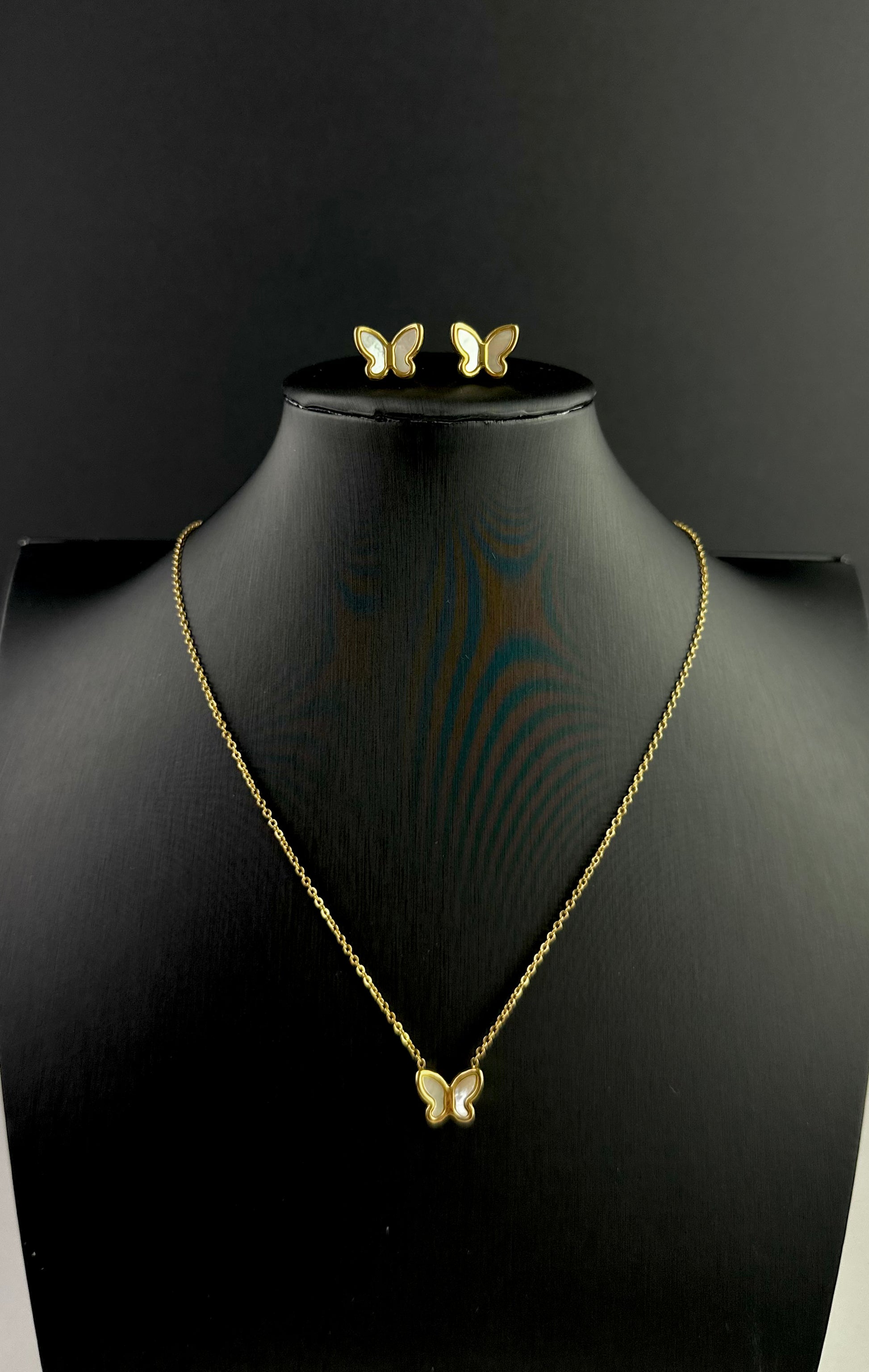 Perfectly mismatched, these beautiful set of Butterfly necklace and earrings made of gold-plated titanium steel with shell that makes a classy and simple statement about your personality. Pair with a chic column dress or glamorise your favourite boho outfits.