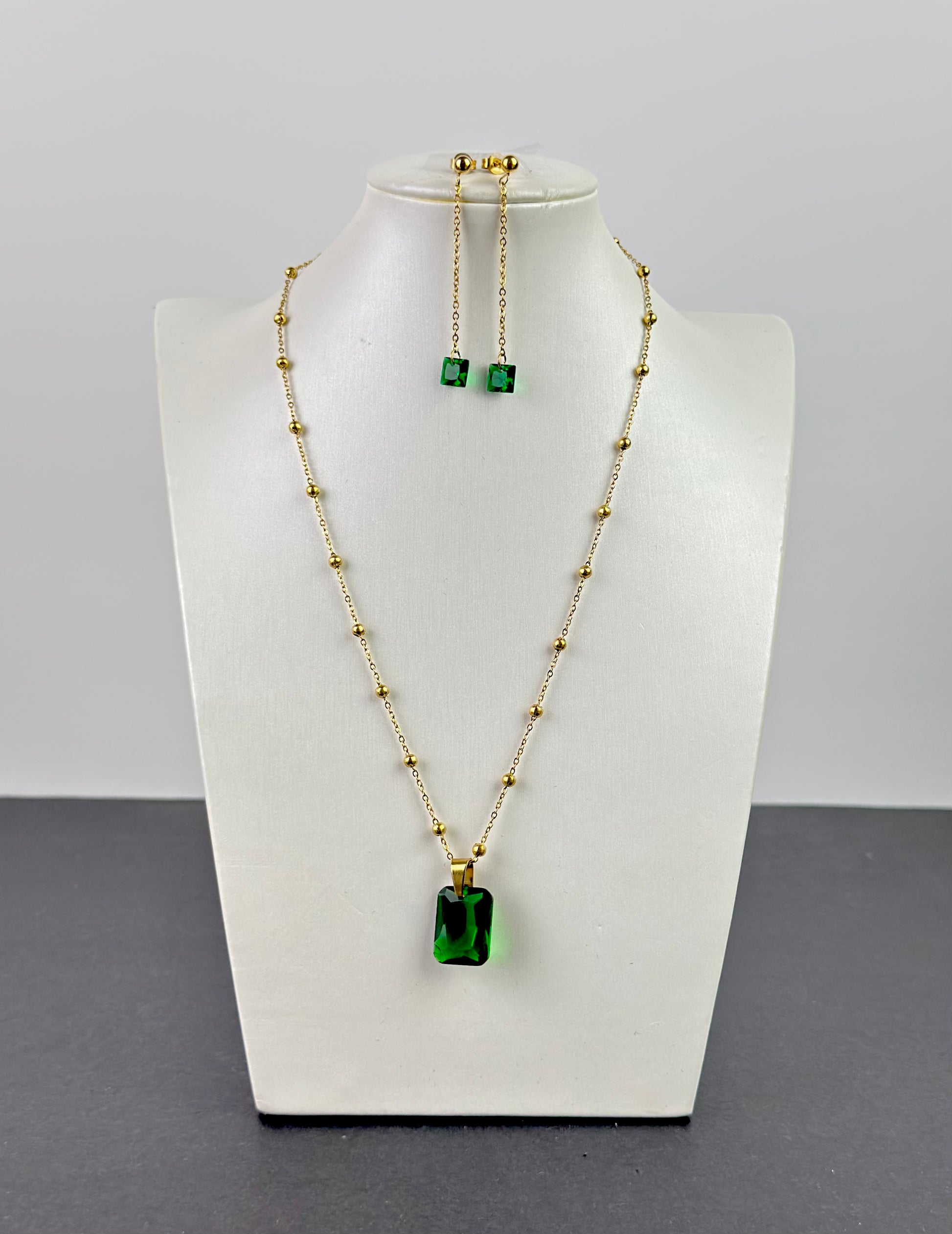 The Emerald Jewellery set is a stunning collection that is perfect for any special occasions. It is made of deep green emerald crystal with titanium steel metal that is simple and understated.