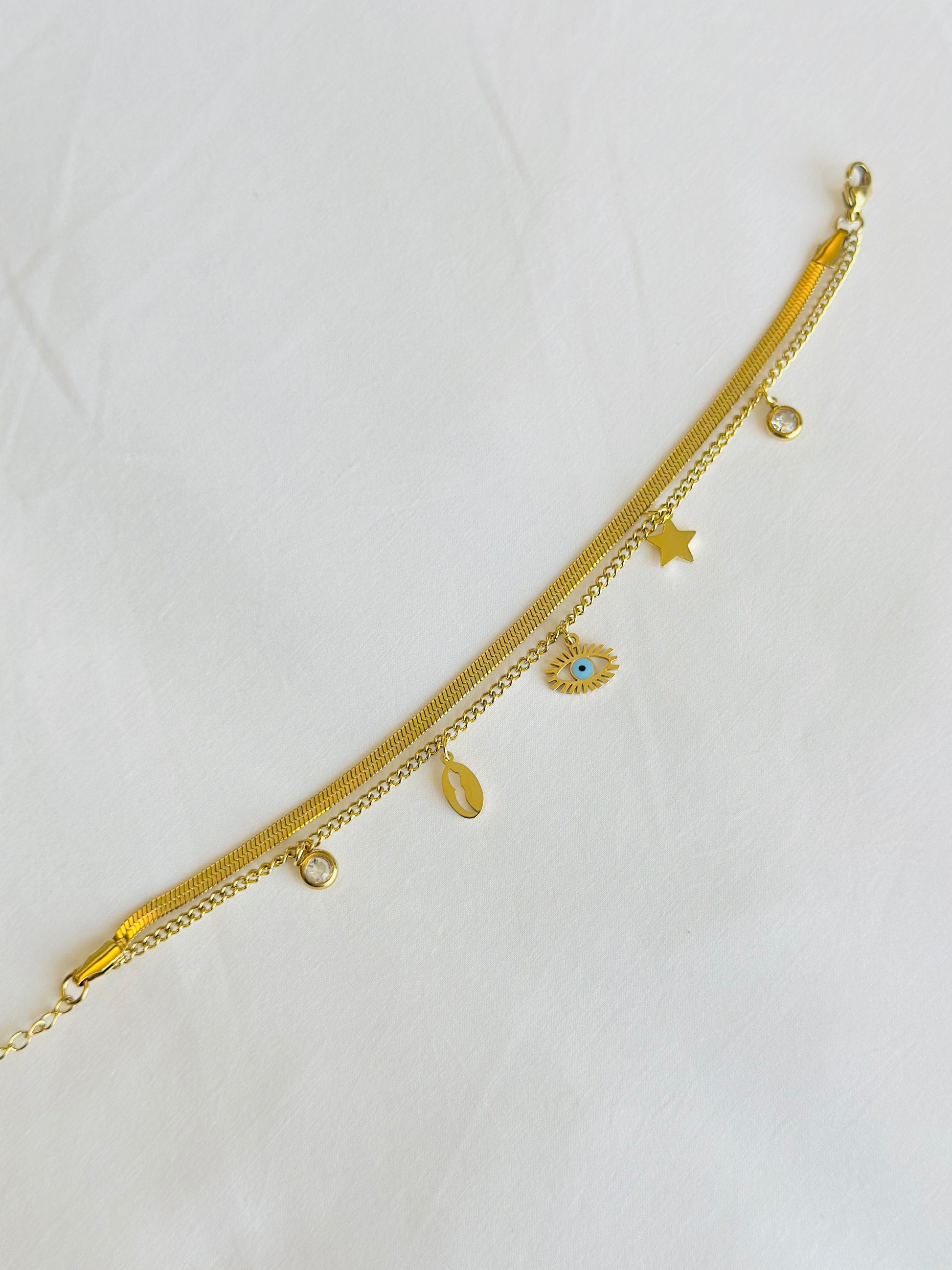 The evil eye snake bone layered bracelet is a trendy and symbolic accessory that combines style with spiritual protection.