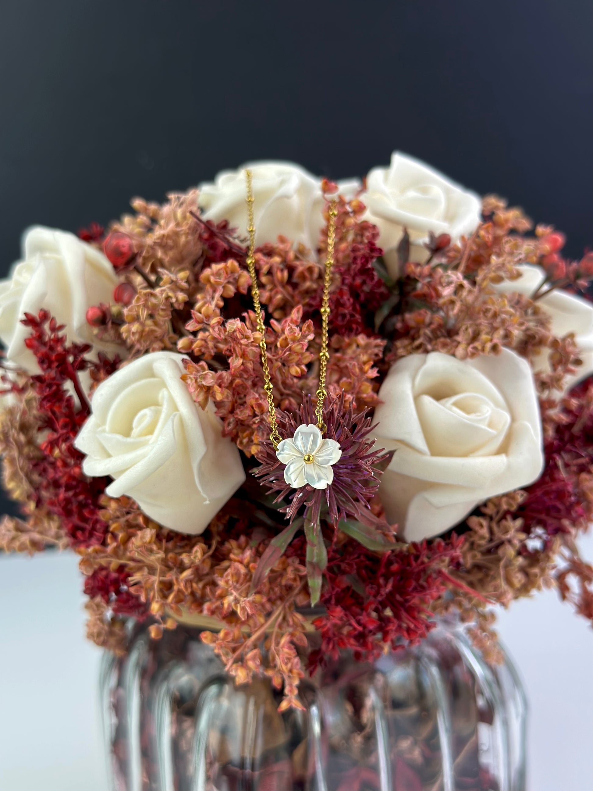Flower necklace is a delicate and elegant piece of jewelry that features a floral design with white-colored single flower made with shell material. It embodies the purity, and grace making it a timeless accessory. It is made of titanium steel with 18k gold-plated.