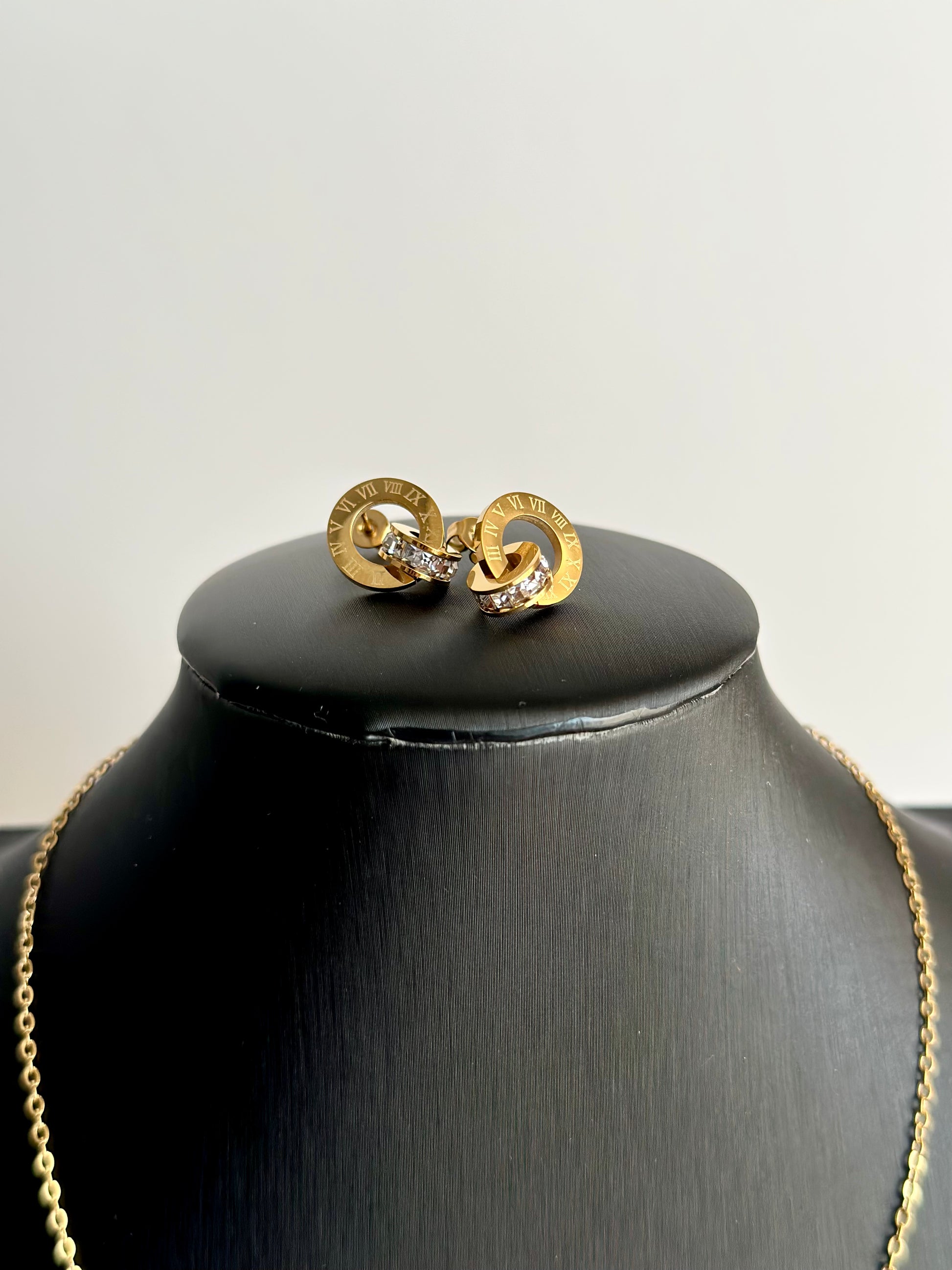 Fabulously flamboyant rose gold plated titanium steel rhinestone minimalist earrings are the ultimate accessory for evening attire. Shimmering cubic zirconia encrusted rings add elevated glamour to the sleek Roman numeral decorated discs.
